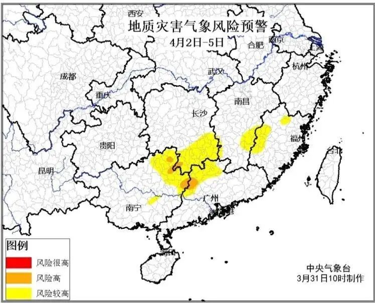 受降雨影响,湖南南部、江西西部和东部、福建西部和北部、广西东北部和中部、广东西北部等地的部分地区地质灾害气象风险较高,其中,湖南西南部、广西东北部、广东西北部等局地地质灾害气象风险高,需加强次生灾害防范。